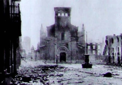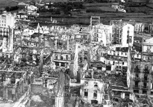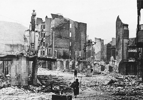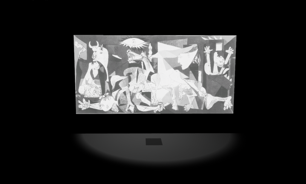 O bombardeamento aéreo da cidade basca de Guernica pelos alemães durante a Guerra Civil Espanhola (a 26 de abril de 1937) é retratado por Pablo Picasso no mesmo ano. Nesta altura, o artista reside em Paris e tem acesso a imagens que mostram o cenário desolador pós-ataque, publicadas em diversos jornais. A obra “Guernica” não faz alusão a um evento específico desse dia. O nosso olhar é conduzido, do centro para cada um dos lados, através de uma cena de puro terror e barbárie.